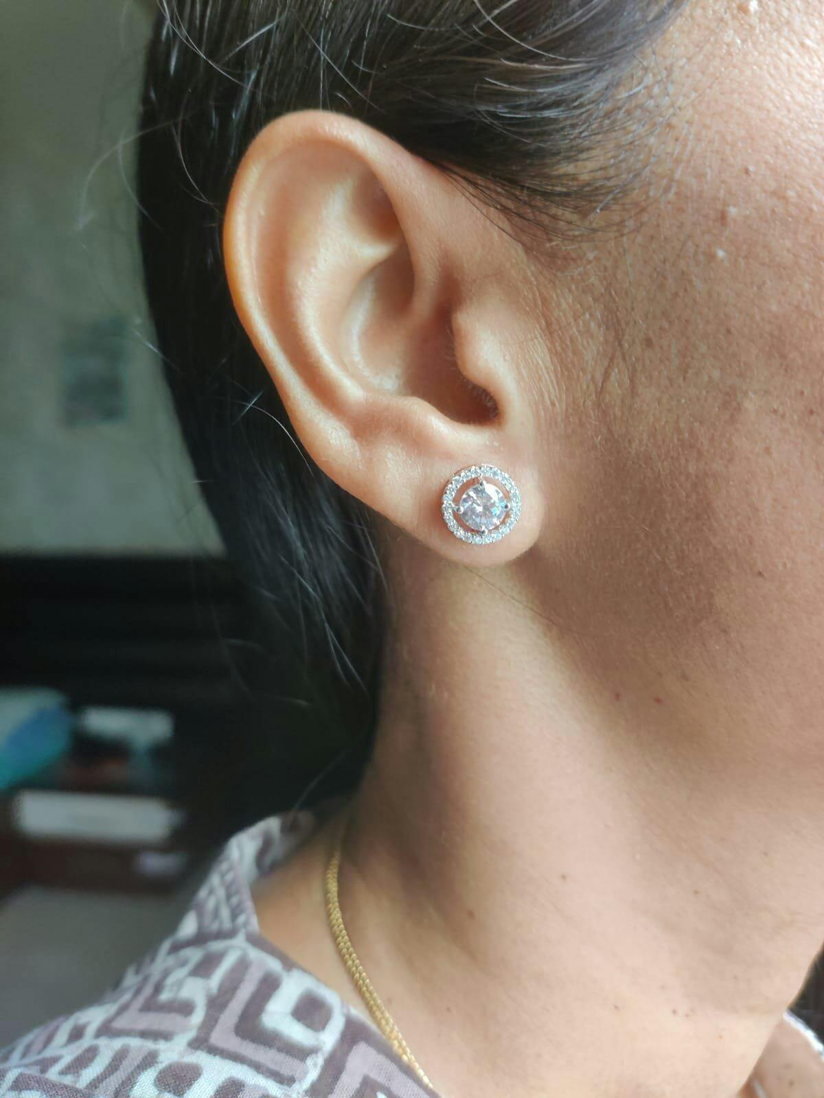 Radiate timeless charm with thus exquisite halo round stud earring, designed to make a subtle yet striking statement. At its heart lies a brilliant-cut American diamond, surrounded by a dazzling double halo of smaller stones for enhances sparkle and sophistication.